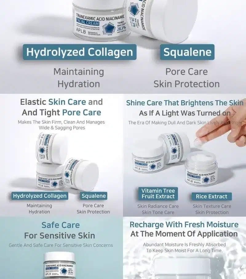 This cream contains Tranexamic Acid, Niacinamide, and Centella Asiatica that offers refreshing moisture recharge to dry skin. A method of applying formulation technology that protects retinol ingredients to safely reach the skin and absorb the active ingredients with the APLB’s Formulation Technology Wide-Spread Texture system applied to Ginseng Root Extract Ingredient.Cosmetic ingredient safety grade 1-2.Protects the skin from irritation with weak acidity close to healthy skin pH. Free of 9 ingredients without fragrance.