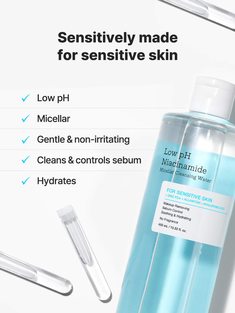COSRX Low pH Niacinamide Micellar Cleansing Water is a low pH cleansing water that gently removes makeup and impurities while keeping skin hydrated.Helps control excessive sebum production with Niacinamide and Zinc PCA.Contains Sodium Hyaluronate and Panthenol to hydrate and strengthen skin barrier.Completed eye irritation test.Suitable for sensitive skin.