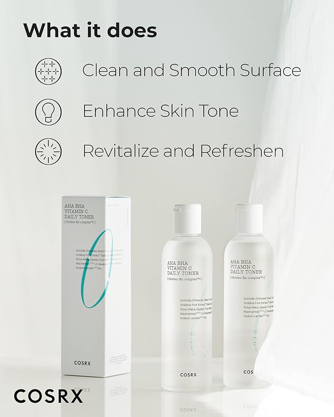 COSRX Refresh AHA BHA Vitamin C Daily Toner is an exfoliating daily toner that effectively eliminates flakes and dead skin cells while keeping pores clear. Infused with natural clarifying acids, this treatment toner controls excess oil and sebum while hydrating depleted skin. Best for all skin types, especially dull, and dry skin prone to pore congestion. AHA, BHA, and Vitamin C work together to reveal soft and bright skin.