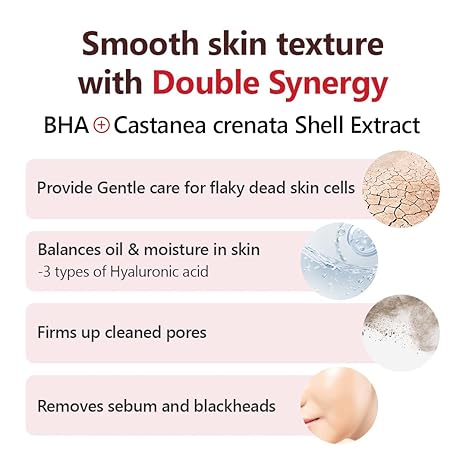 Dual care for pores- Cleanse pores with BHA and tighten pores with Chestnut shell. BHA and Chestnut shell extract have a synergistic effect for tightening pores.
