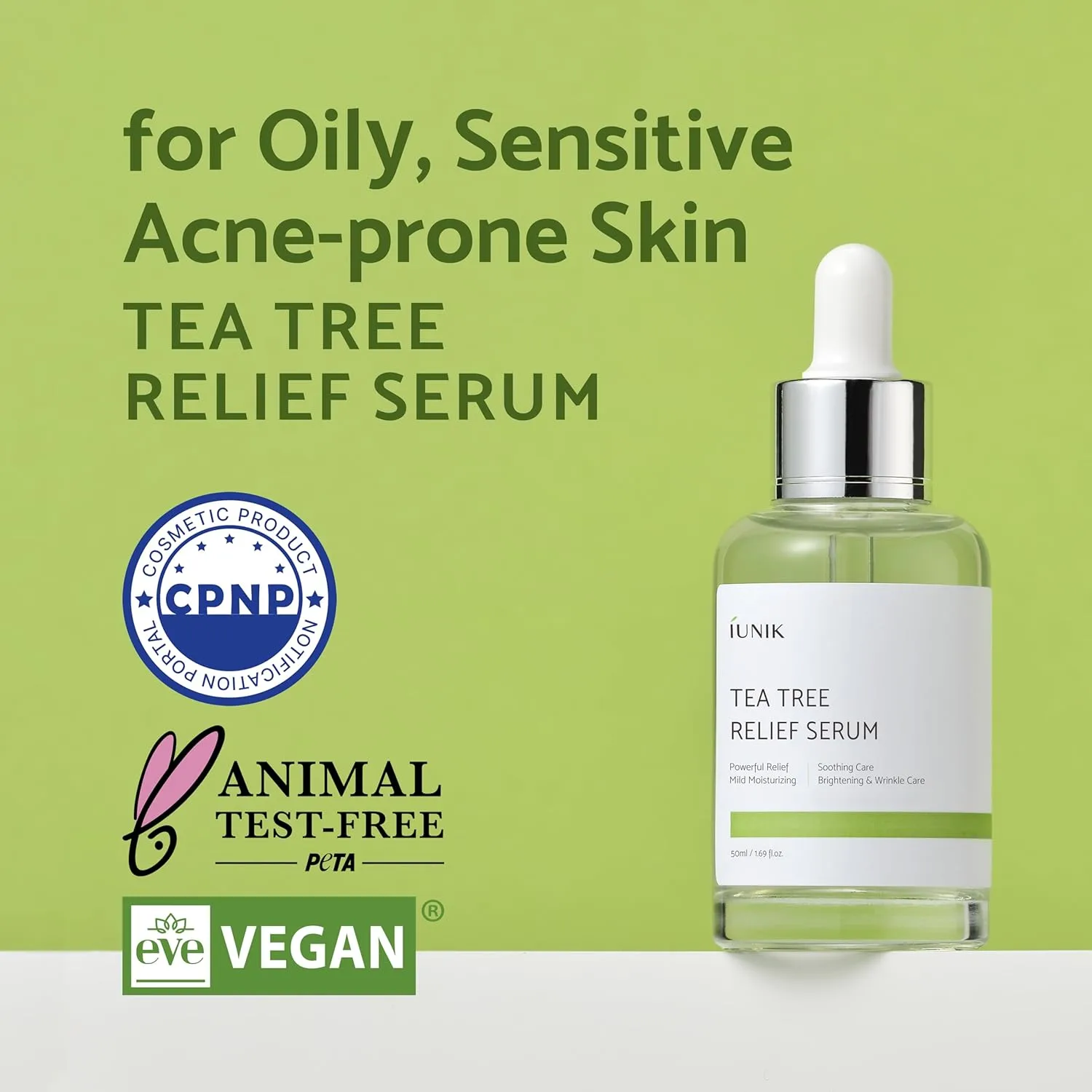 - iUNIK Relief serum infused with tea tree and Centella Asiatica leaf water to soothe and heal skin for a clearer complexion.