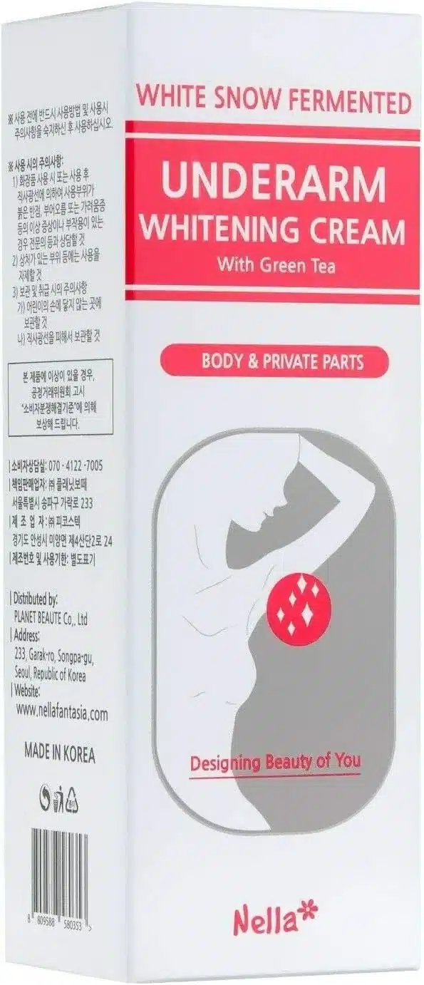 Nella White Snow Fermented Underarm Whitening Cream With Green Tea is a cream designed to lighten and brighten the underarm area. The cream contains green tea extract, which is known for its antioxidant and skin-soothing properties. The cream also contains fermented ingredients, which help to improve the skin’s texture and tone. The cream is formulated to be gentle on the skin and can be used by people with sensitive skin. It is free from harmful chemicals like parabens, sulfates, and phthalates, and does not contain any artificial fragrances or colors. The cream has a lightweight texture that absorbs quickly into the skin without leaving any greasy or sticky residue. With regular use, the cream helps to even out the skin tone and reduce the appearance of dark spots and pigmentation in the underarm area.