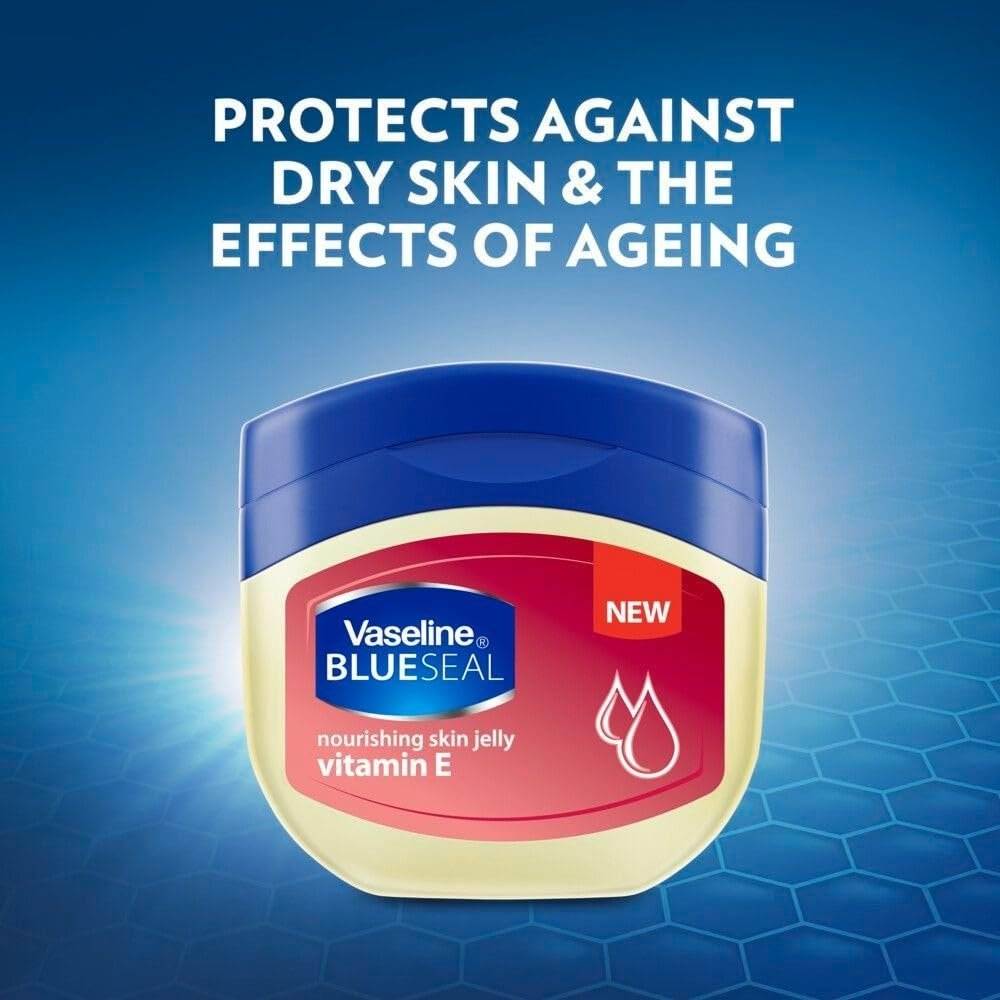 Vaseline Blue Seal Vitamin E Petroleum Jelly protects against dry skin and the effects of ageing, keeping your skin smooth and elastic. Vaseline Blue Seal Vitamin E Petroleum Jelly is a deep moisturizer with a fast-absorbing formula and the added benefits of vitamin E. Vaseline Petroleum Jelly is the world’s best-known hypoallergenic and non-comedogenic (doesn’t block pores) moisturizer for all-round skin care. Is a light hydrating petroleum jelly that absorbs fast with a non-greasy feel. Use Vaseline with vitamin E daily to moisturise dry skin and protect against ageing